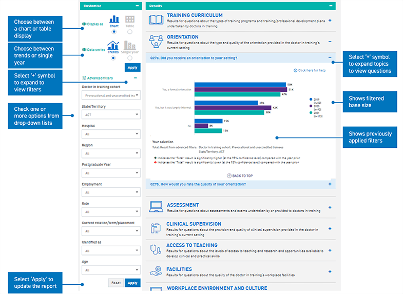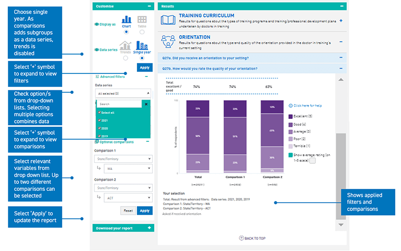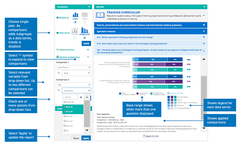 Find out how you can create your own tailored report using the Medical Training Survey (MTS) datasets including how to; compare datasets across years, specialist medical colleges and states/territories, switch on the national average, change how the data is displayed (graph or table format), output your tailored report as a PDF and see the statistical significance. Click play on the instructional video above and discover the many possibilities of the MTS interactive data dashboard.